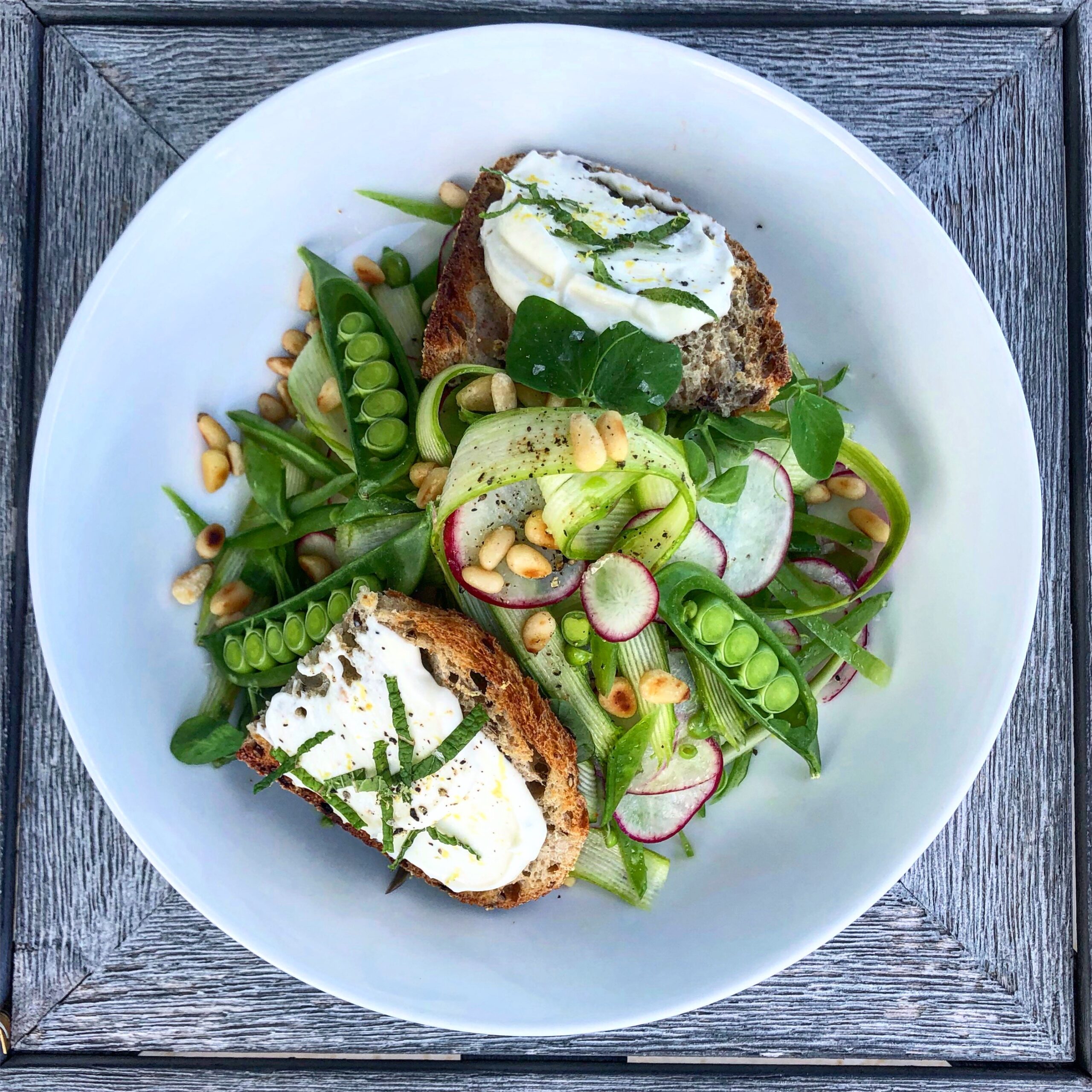 Asparagus, Snap Pea, and Radish Salad with Whipped Ricotta Toast