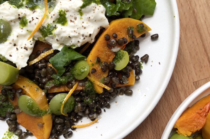 Black Lentil, Butternut Squash and Burrata Salad with Parsley Caper Dressing