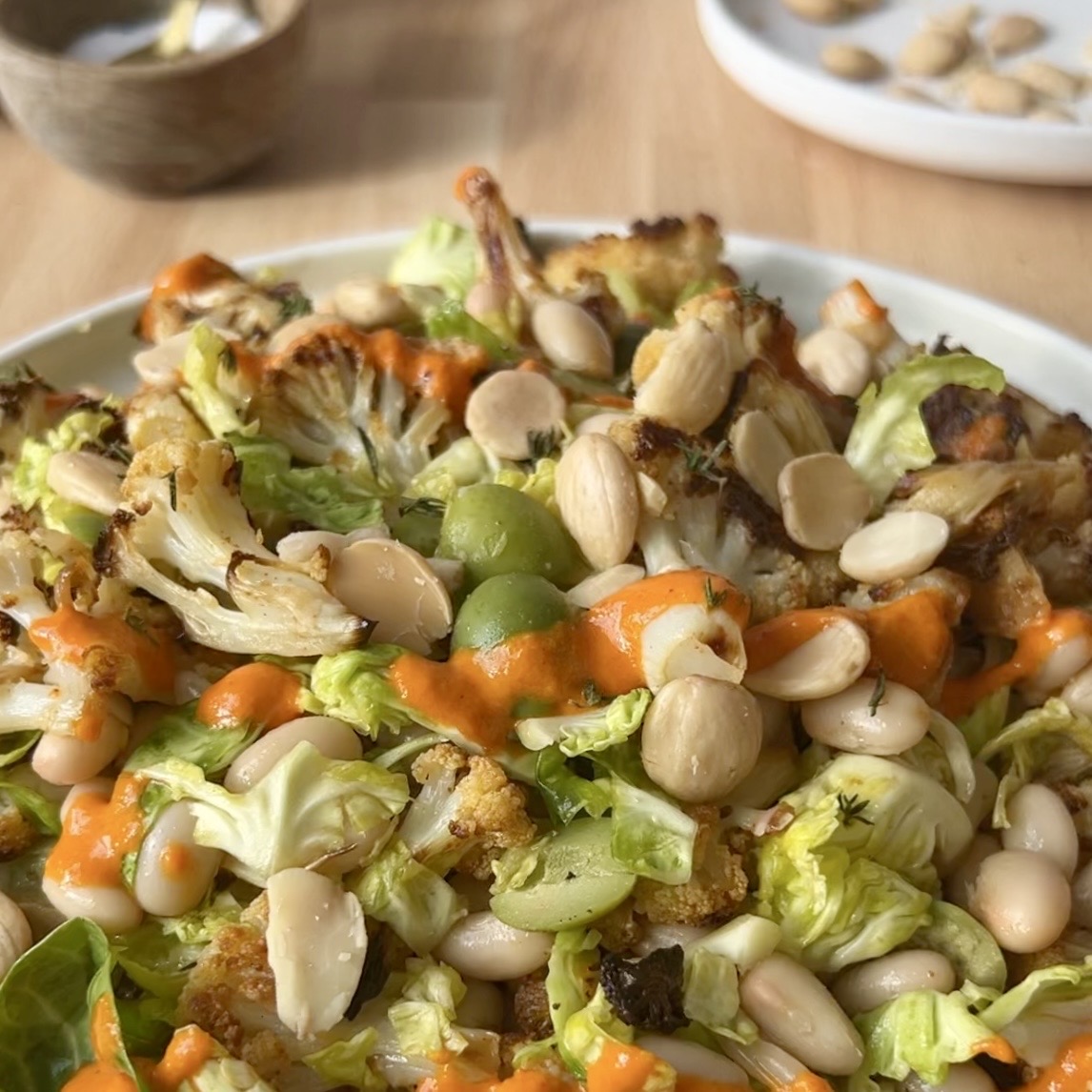 Roasted Cauliflower Salad with Smashed Brussels Sprouts White Beans and a Smoky Romesco-ish Dressing