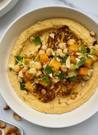 Roasted Radish Fennel and Endive Salad on Beet Hummus