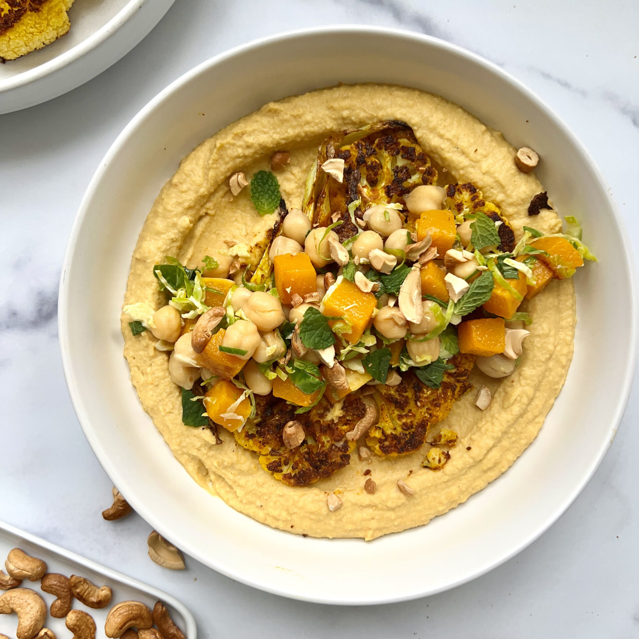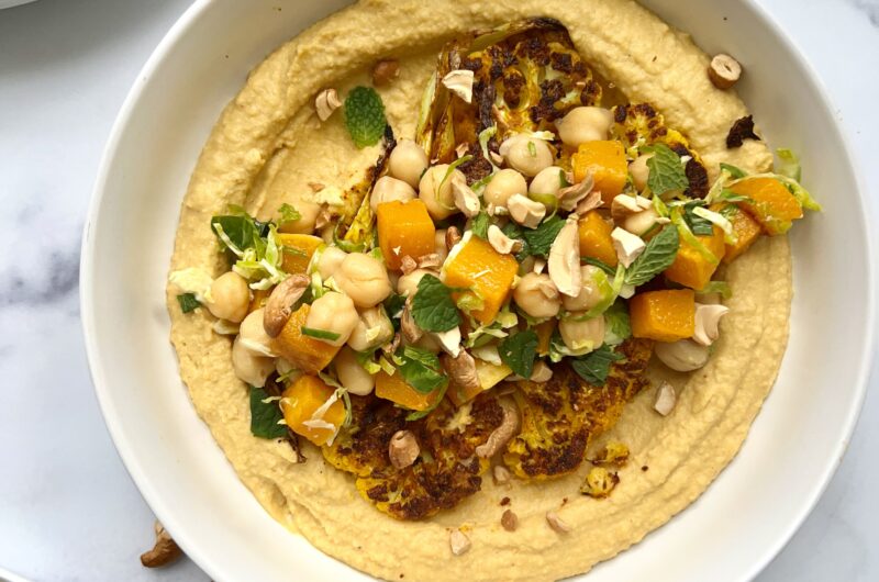 To build the Cauliflower Steak and Butternut Squash Hummus Plates, you dollop a bit of the Butternut Squash Hummus on the plate, then spread it into a circular base upon which you will place your cauliflower steak. Top the cauliflower steaks with your Brussels Sprout, Butternut Squash and Chickpea Salad and finish your plate with a little za’atar seasoning. That’s it!