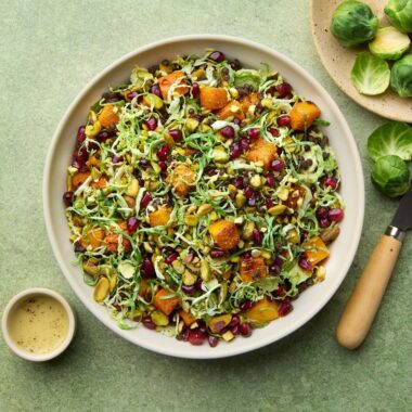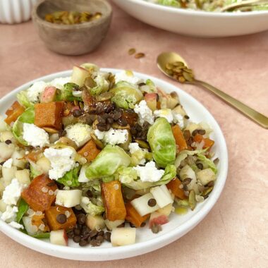 Greek Inspired Beet Smashed Brussels Sprout and Quinoa Salad