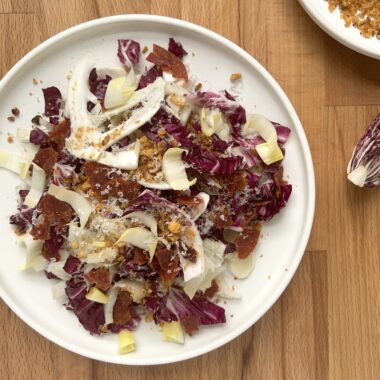 Endive, Fennel and Radicchio Salad with Soppressata Crisps and White Balsamic Vinaigrette (“Winter Greens Salad”)