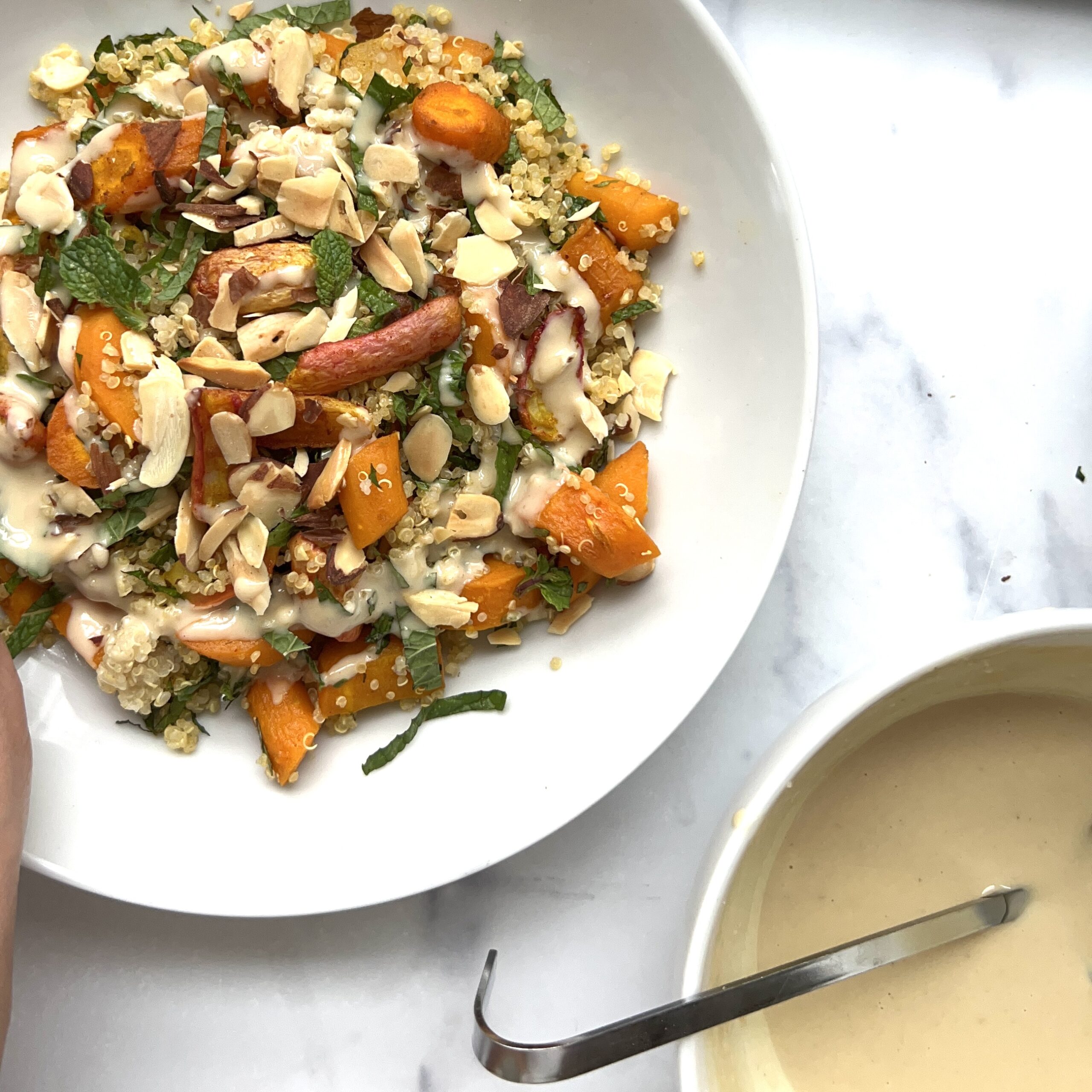 Roasted Carrot, Radish and Quinoa Salad with Miso Tahini Dressing