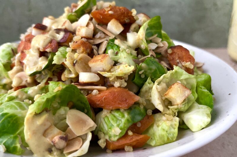 This salad celebrates the beauty of raw, smashed Brussels sprouts, tossed with roasted carrots caramelized in warm spices, nutty quinoa, golden halloumi “croutons” and toasted almonds. The creamy Orange Tahini Dressing ties it all together with bright citrus and nutty depth. It’s a salad that feels both hearty and refreshing, proof that Brussels sprouts don’t need to be cooked or hidden under bacon or heavy cream to taste incredible. They just need the right technique. Serve it warm for cozy fall dinners or pack it up for lunch and watch everyone’s sprouts skepticism melt away. If you’ve never smashed your Brussels before, consider this your official invitation to start.