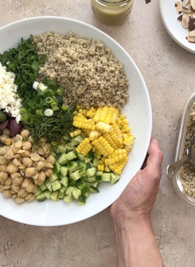 1 cup canned chick peas, drained 1 cup green beans, trimmed and halved (or cut into thirds if really long) 1 cob of corn 1 cup celery, shaved on a mandolin 1 cup cherry tomatoes, halved 1/2 cup red onion, small dice 1/2 cup aged white cheddar, crumbled 1/2 cup […]